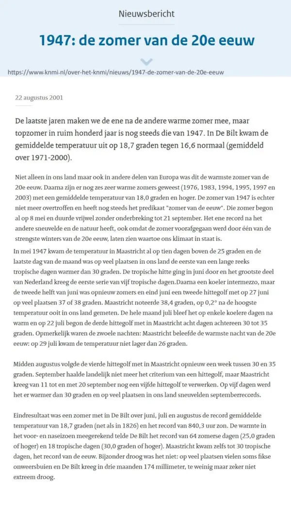Het KNMI heeft het er zelfs over dat de zomer van 1947 onovertroffen de warmste zomer betrof !